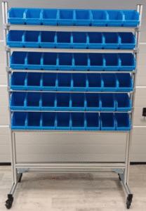 Un rack à bacs à bec équipé de roulettes. Les bacs sont inclinés pour une amenée automatique des pièces.